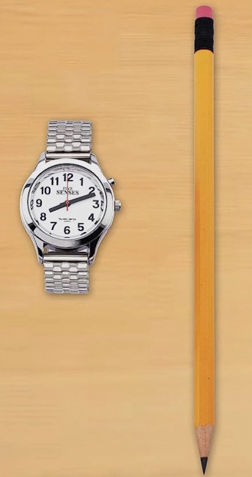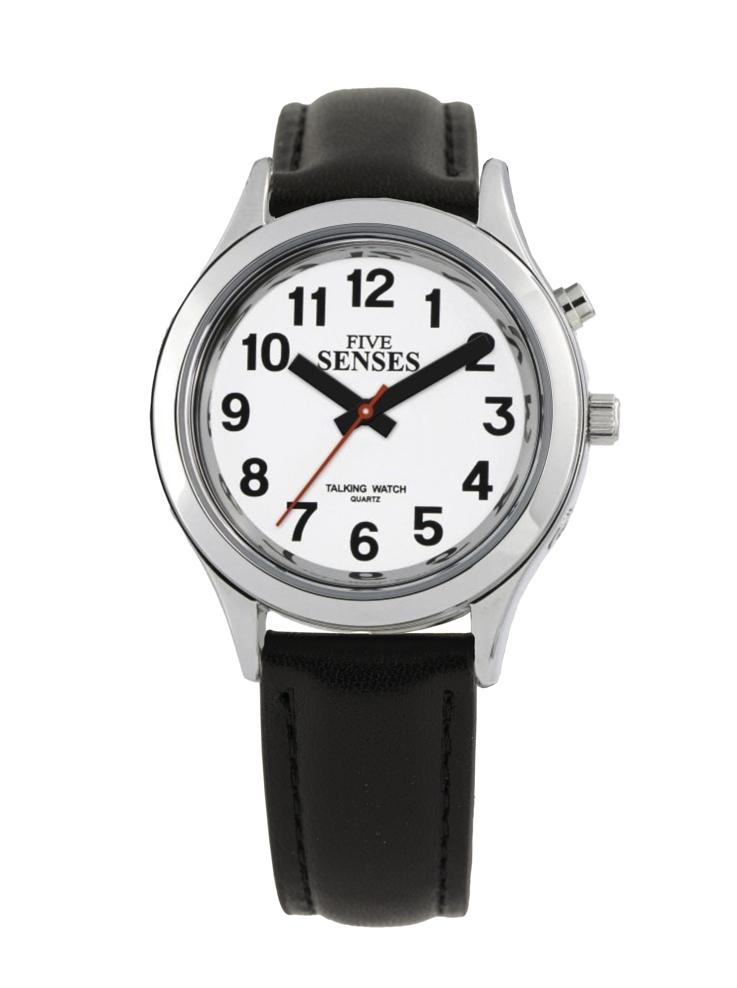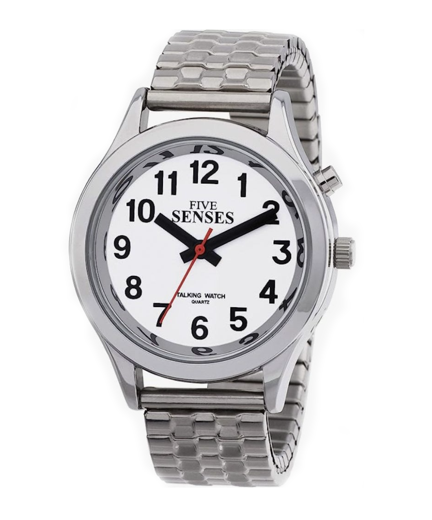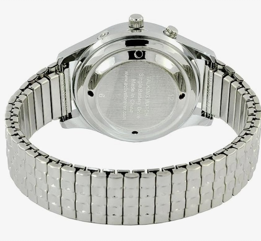This silver-tone Low Vision 2nd generation VHAS Analog Talking Watch. Talks the time, day, date, month and year in a pleasant clear male voice at the touch of a button.