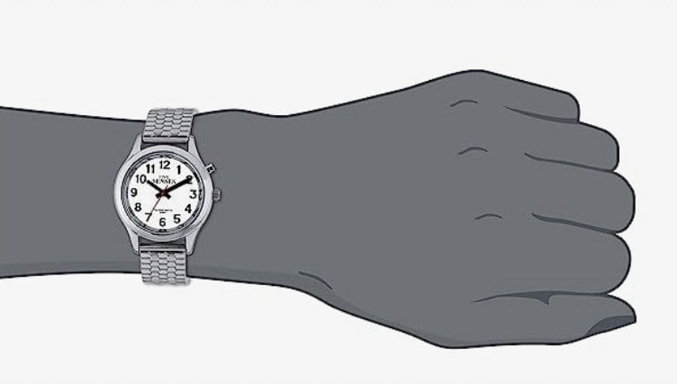 A casual styled analog talking watch is ideal for those with Low Vision or Blindness. The easy-to-read bold black Arabic number, big Hour, Minute and Second hands on a white dial framed with a stylish round silver-tone metal case. Scratch resistant anti-reflective mineral crystal plus a comfortable stainless steel flex expansion bracelet fits almost all wrists. The VHAS talking watch only uses 1 battery (included) for the movement of analog hands and digital voice.
