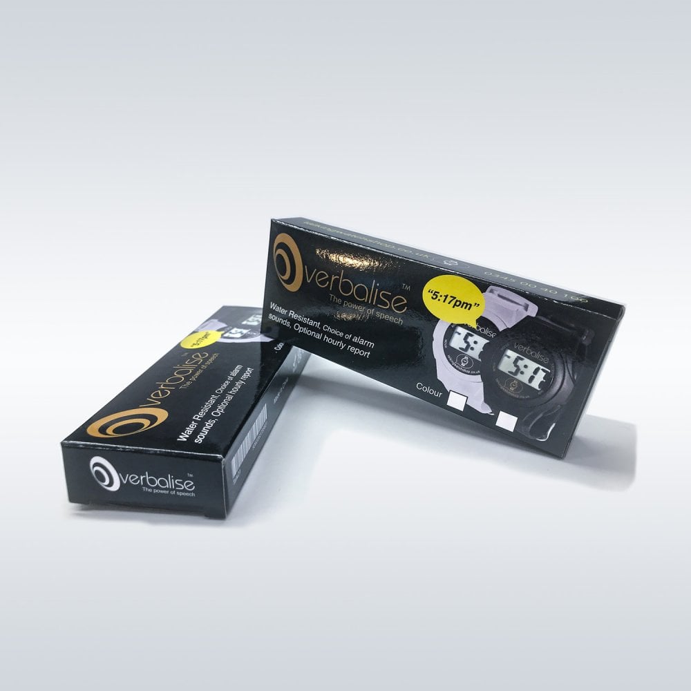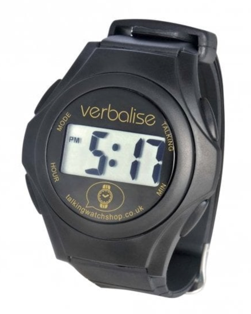 Verbalise unisex talking watch with an easy to see LCD digital display, black case and matching hygienic plastic strap with metal buckle.