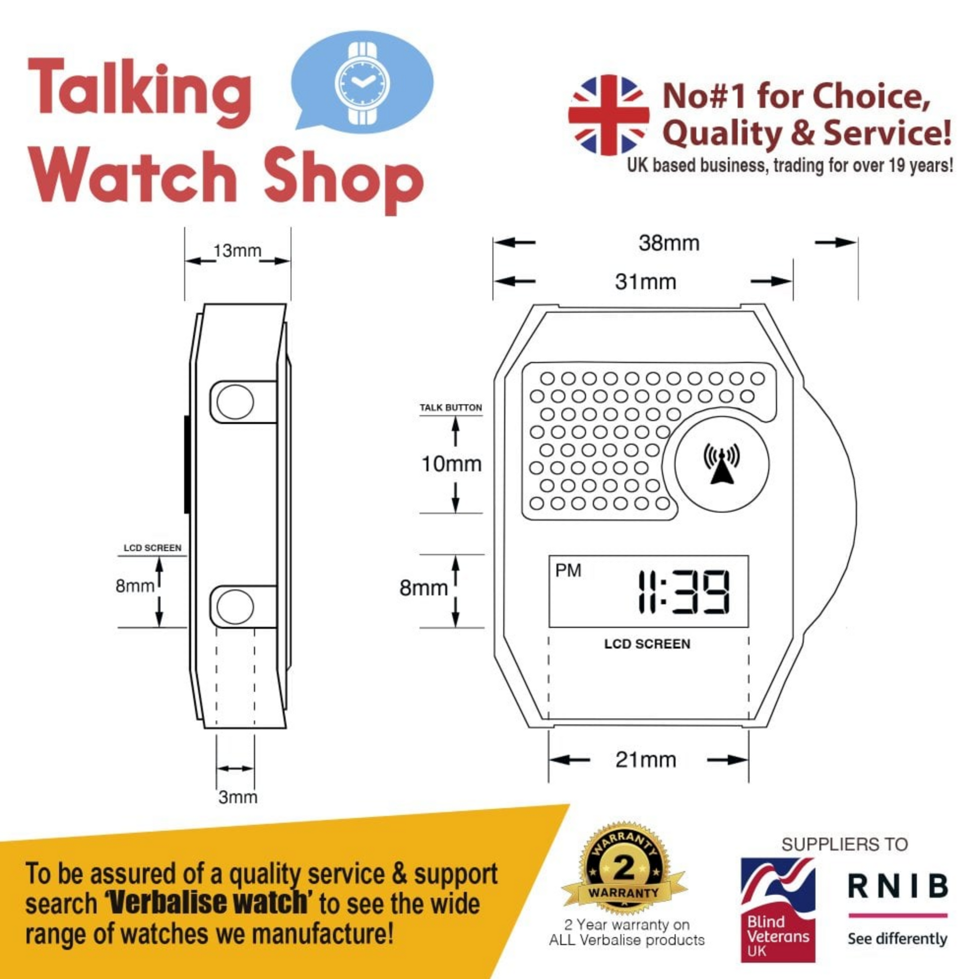 This easy to use Verbalise digital talking watch has a button at the top to announce the time and date, as well as a digital display for the time.