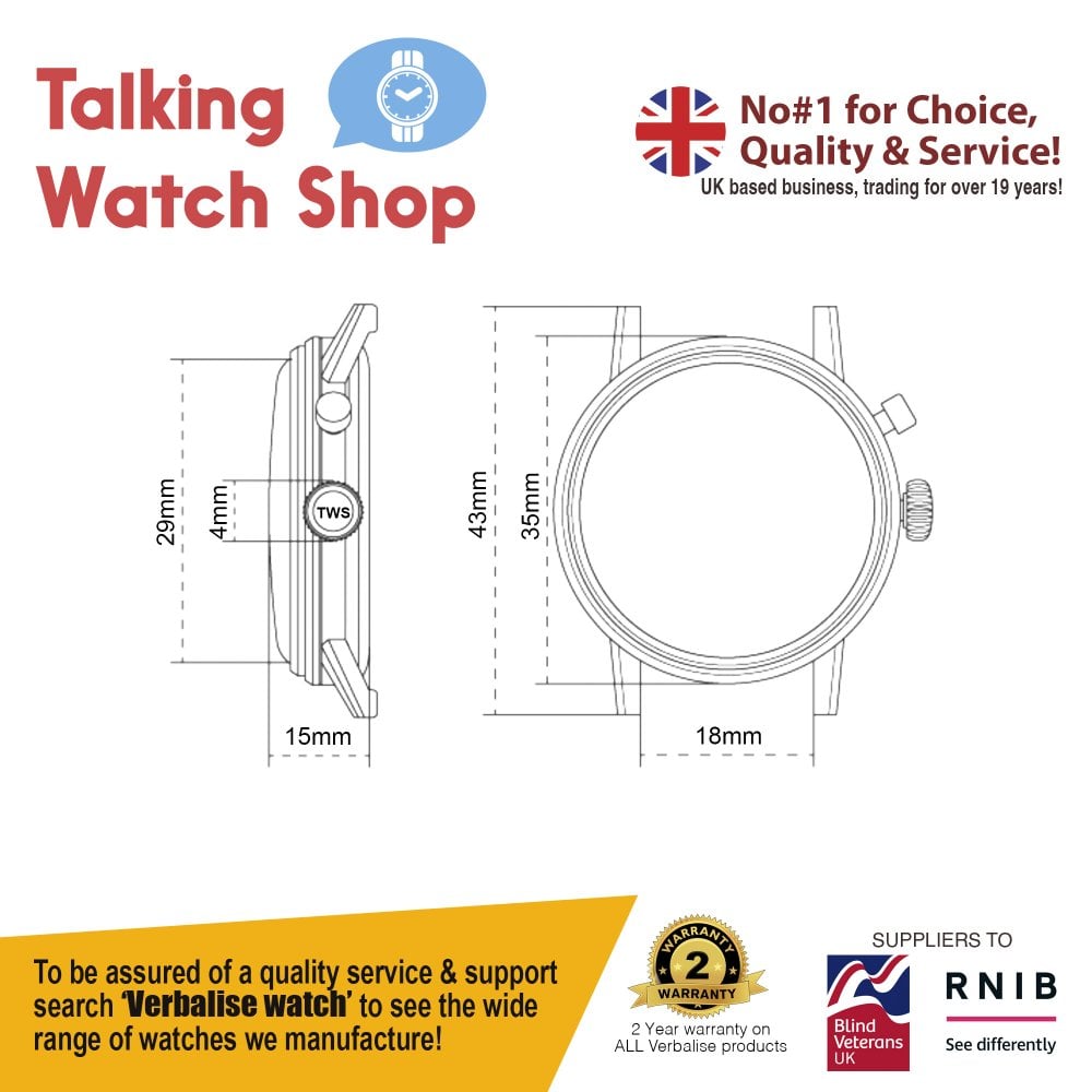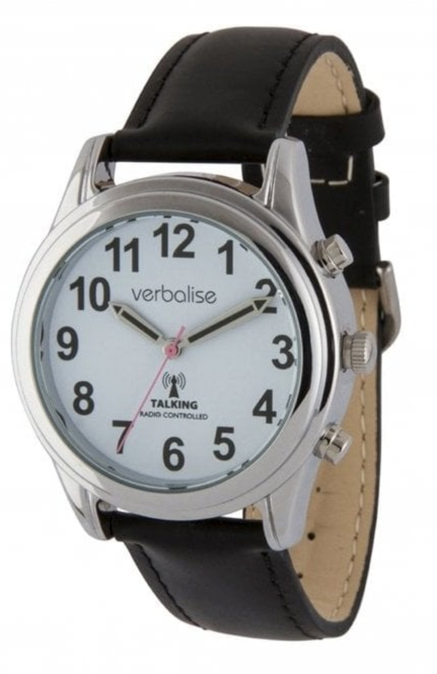 This Verbalise talking watch has a silver case that surrounds a white face containing black contrasting numbers. It also features a pink second hand and black hands that are edged in silver to compliment the case colour. Fitted with a choice of watch strap.
