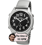 The big Arabic number indexes big Hour, Minute and Second-hands, on a black dial framed with a stylish round silver-tone plastic case. Scratch resistant anti-reflective mineral crystal plus a comfortable stainless steel flex expansion bracelet fits almost all wrists. The Atomic Radio Controlled Talking Watch only uses 1 battery (included) for the movement of analog hands and digital voice.
