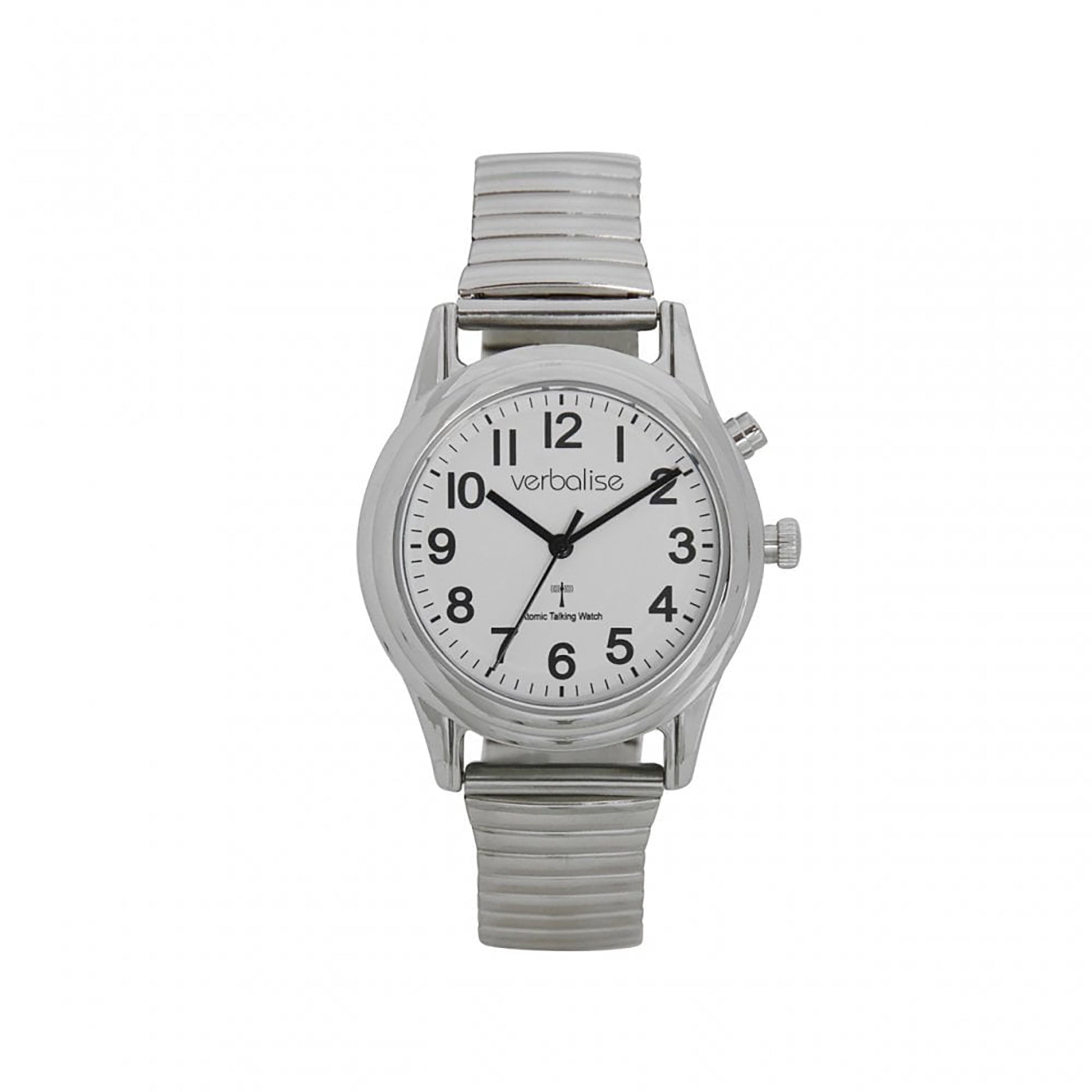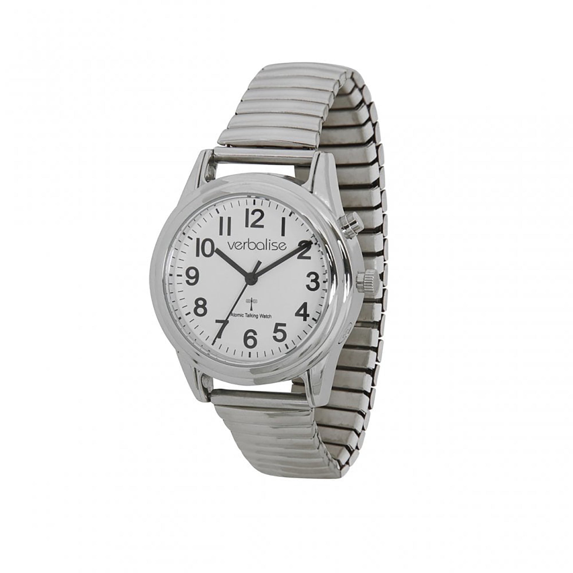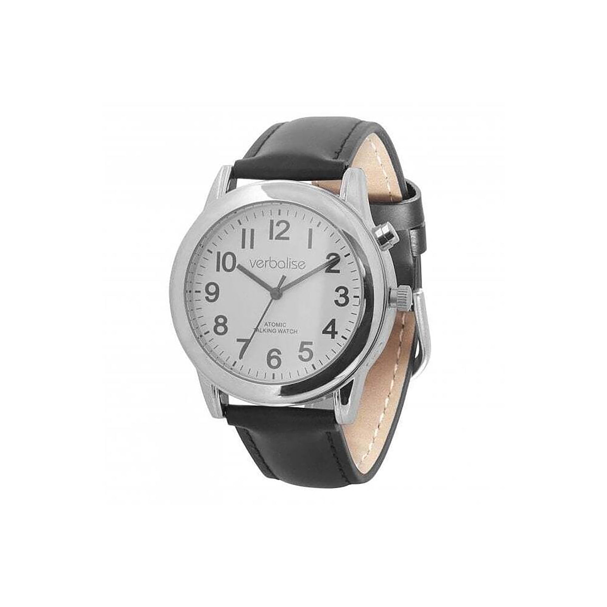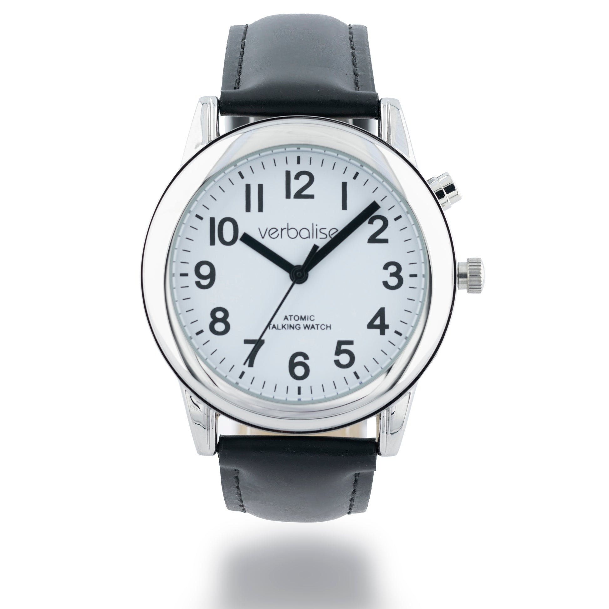 Our new model of the Verbalise men's talking watch 407 series, has a silver chrome alloy case and a white face containing black contrasting numbers and hands. Fitted with a choice of black leather strap or stainless steel expanding strap. The case diameter is 39mm.