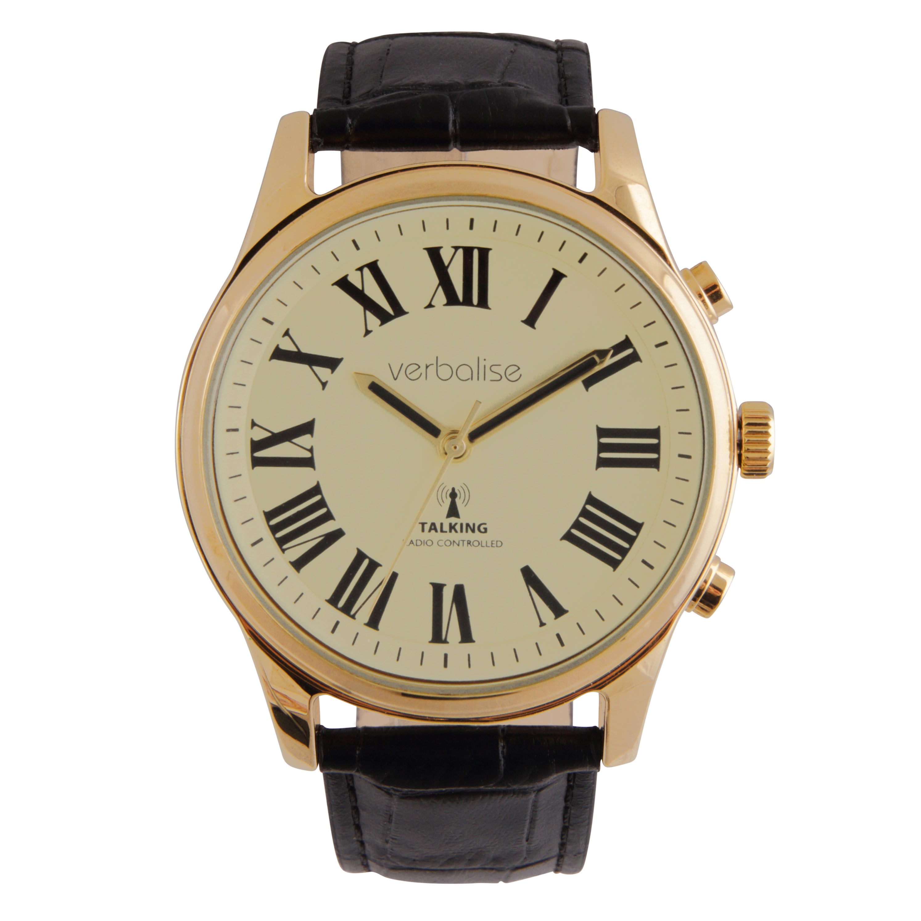 This Verbalise talking watch has a gold case surrounding a gold coloured face, containing large black roman numerals and black hands edged in gold to complement the colour of the case. Fitted with a gold bracelet strap, the case diameter is 41mm.
