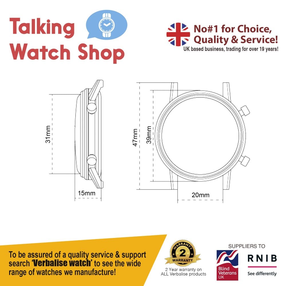 This Verbalise gender neutral talking watch, has a black resin case and a black face containing white contrasting numbers and hands. Fitted with a black leather strap, the case diameter is 39mm.