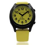 Gender neutral talking watch by Verbalise, has a black resin case and a sun-yellow face with black contrasting numbers and hands making it an easy-to-see dial helping many visual impairment conditions. Fitted with a matching yellow genuine leather strap, the case diameter is 39mm.