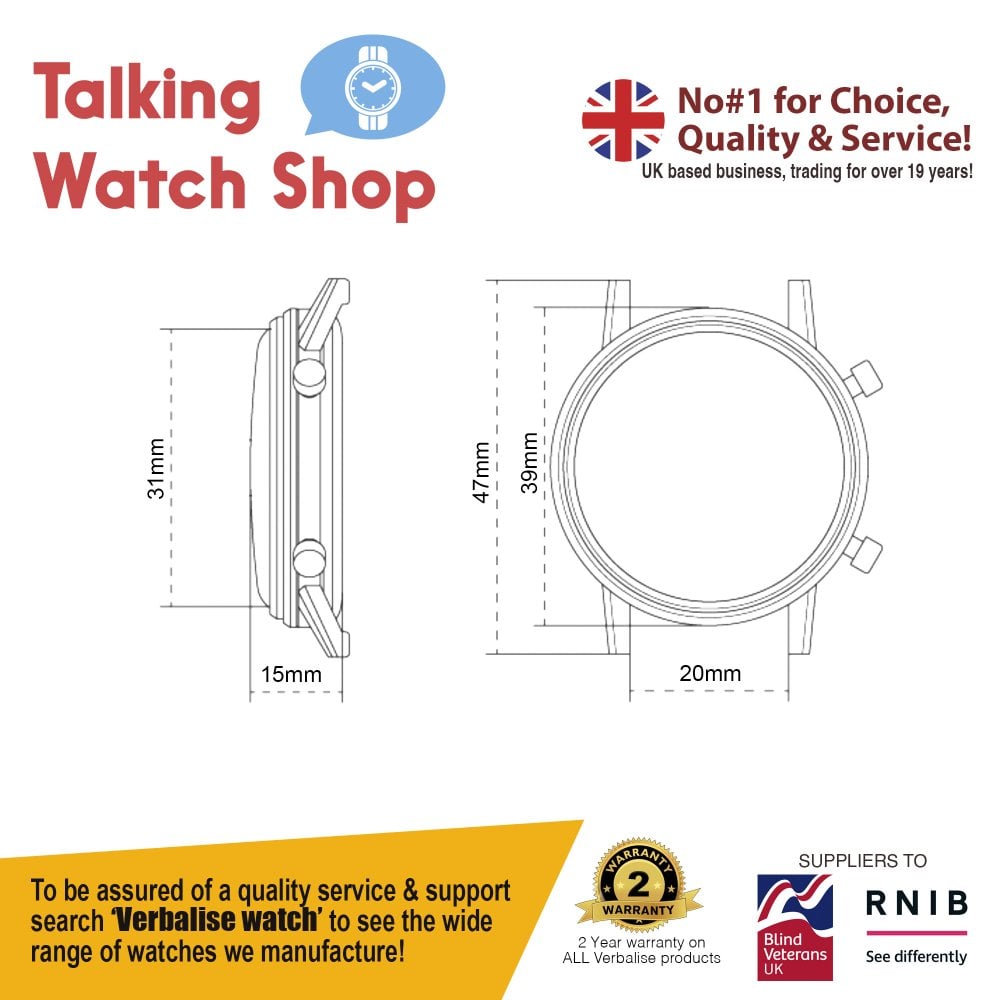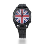 Limited Edition Unisex talking watch, to celebrate the late Queen's Jubilee. The watch has a black case and a Union Jack design face with black hands and fitted with a black metal expanding strap, other straps available, the case diameter is 39mm.