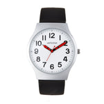 This stylish Verbalise ladies easy-to-see waterproof watch has a white face, with bold contrasting black numbers and red hands edged in silver to match the mirrored slimline case. Fitted with a soft comfortable pin & tuck black silicone strap, this watch is waterproof up to 5-ATM allowing you to surface swim and shower, but it's not suitable for diving