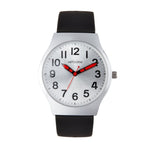 The case diameter of the watch is 35mm with a 2mm edge and the dial has a beautiful silver sun-ray finish. Easy to see black embossed numbers and red hands edged in silver for contrast complete the stylish look.