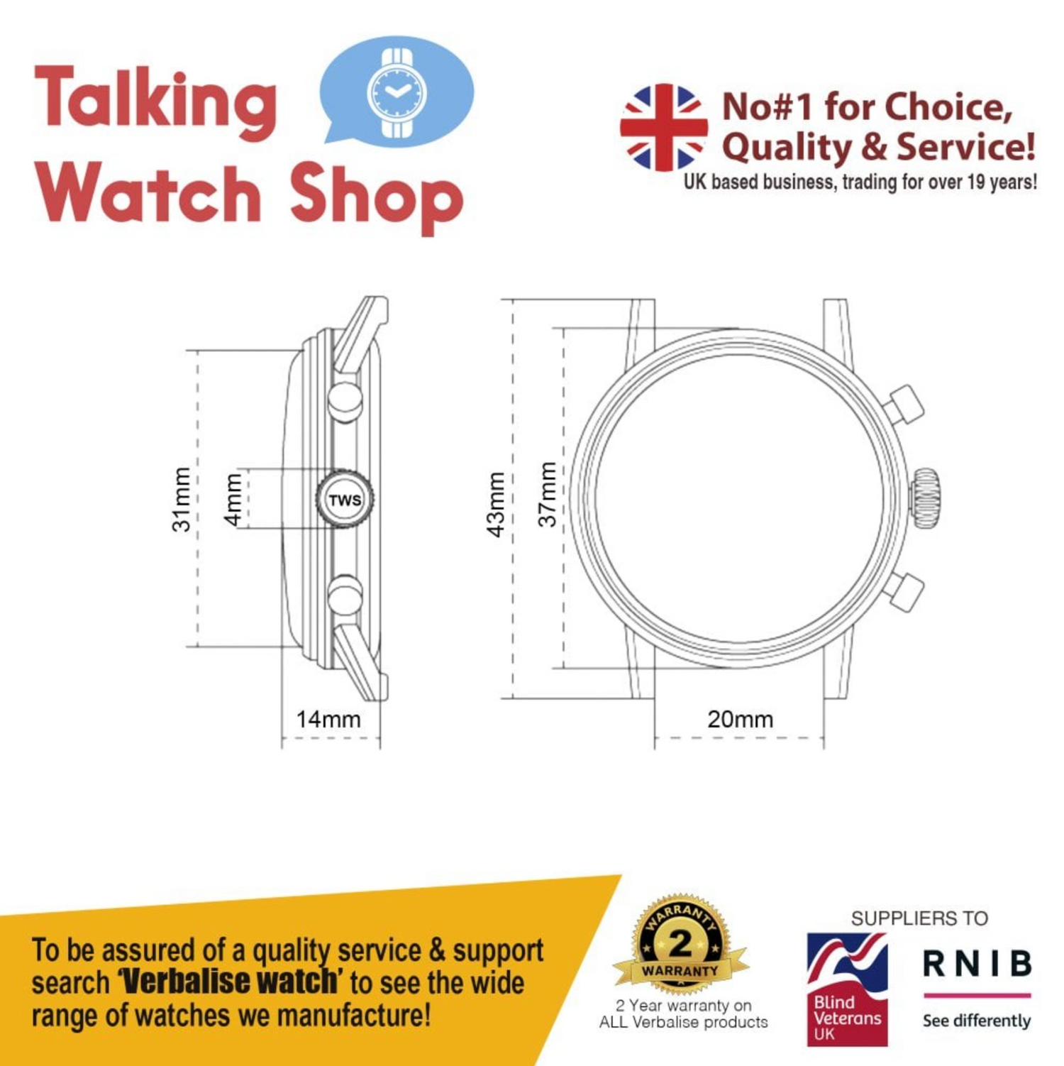 This is a dual voice watch, enabling you to choose between two clear English voices by voiceover artists Simon Fellows or Laura Shavin. Simply press the 2 o'clock button once to hear the time and press it a second time for the date to be spoken to you.
