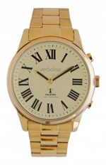 This Verbalise talking watch has a gold case surrounding a gold coloured face, containing large black roman numerals and black hands edged in gold to complement the colour of the case. Fitted with a gold bracelet strap, the case diameter is 41mm.