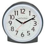This Verbalise talking analogue alarm clock combines a black and white case with a round easy-to-see white face containing bold black numbers and hands and a red second hand. The clock face is surrounded by a white ring that illuminates from the LED placed between the numbers 6 and 7. When the talk/light button is pressed the ring illuminates as long as the voice is speaking.