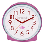 This Verbalise talking analogue alarm clock combines a pink and white case with a round easy-to-see pale pink face containing bold maroon numbers and hands and a red second hand. In addition there are two entwined pink hearts placed on the clock face above the number 6. The clock face is surrounded by a white ring that illuminates from the LED placed between the numbers 6 and 7. When the talk/light button is pressed the ring illuminates as long as the voice is speaking.