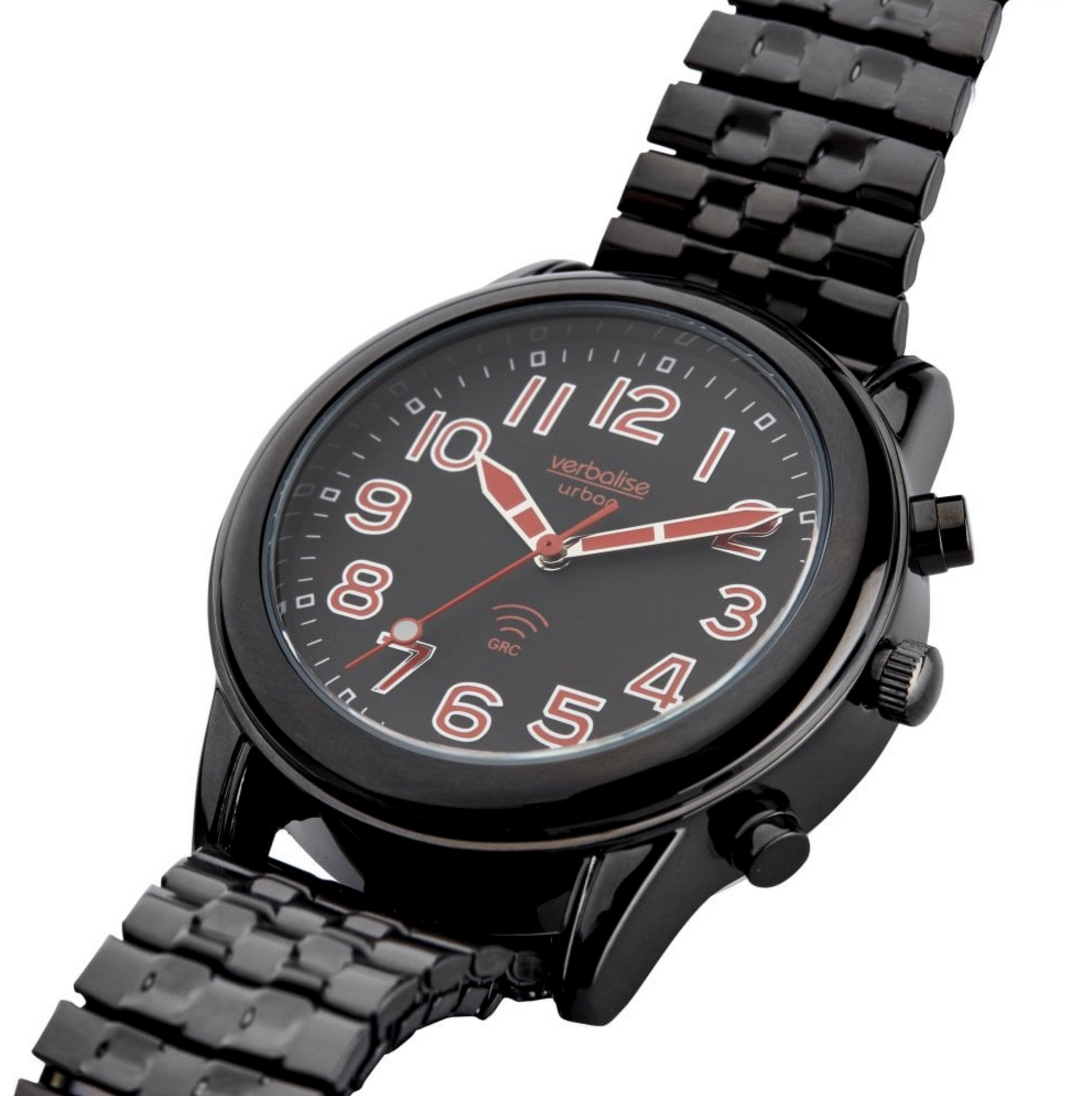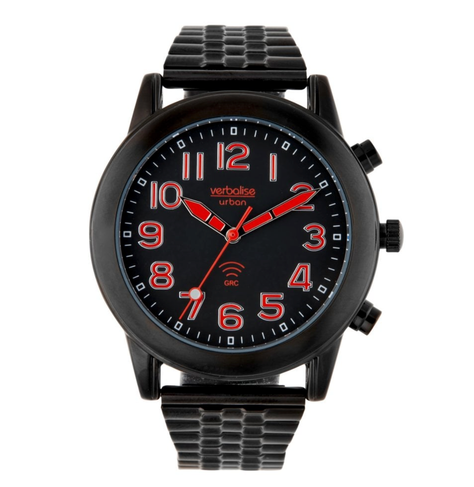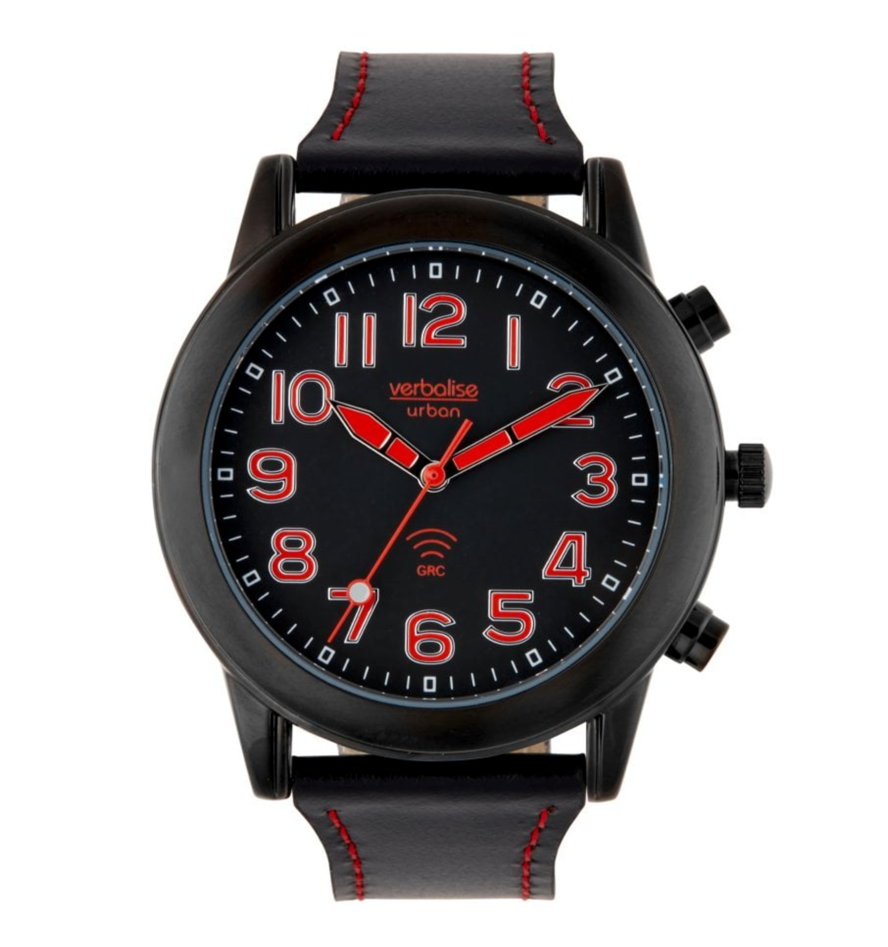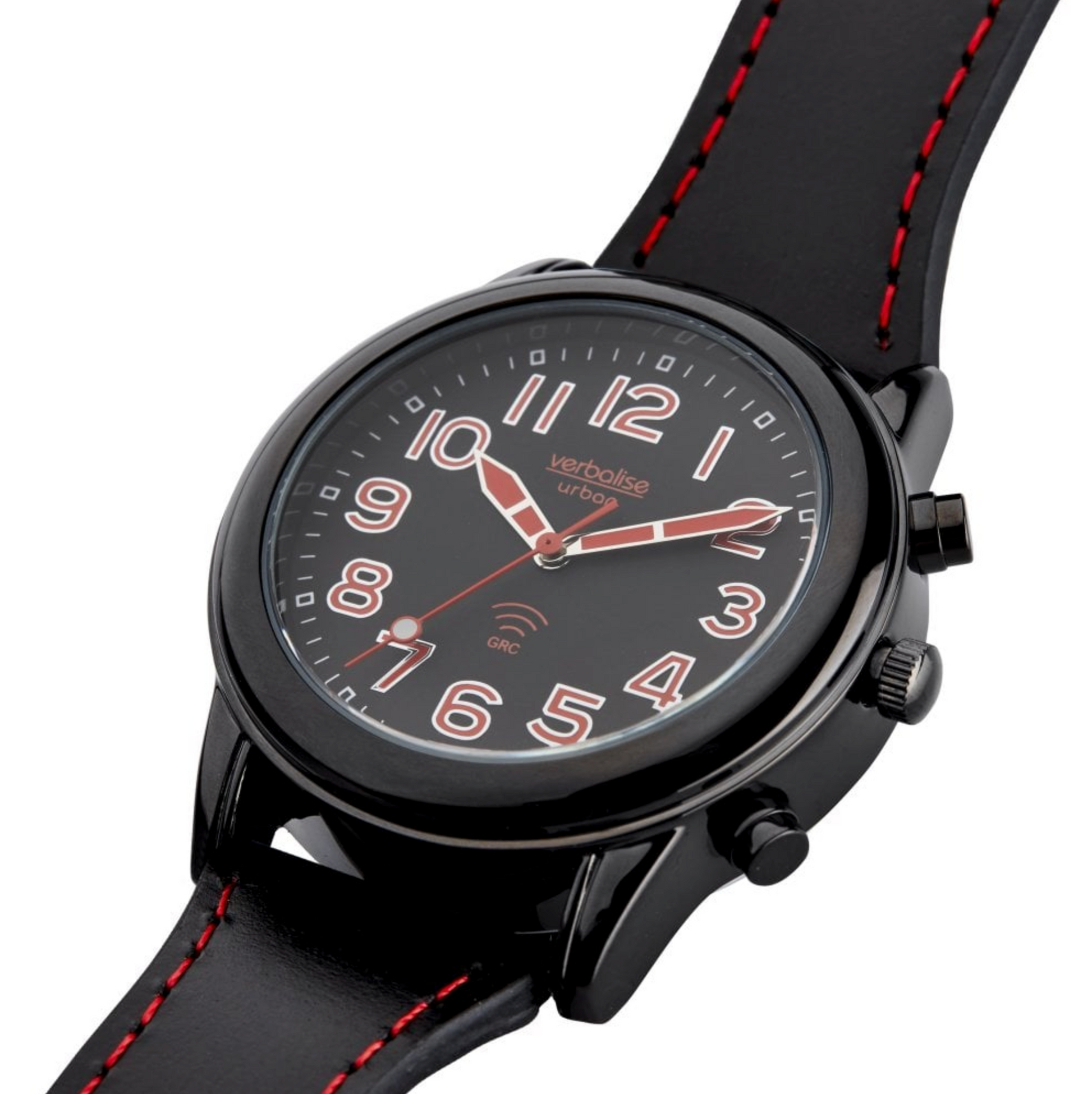 This Verbalise Urban Series men's talking watch has a piano black case surrounding the black face containing red contrasting numbers edged in silver, and red and silver edged hands. Fitted with a black leather pin and tuck strap with red stitching, the case diameter is 39mm.