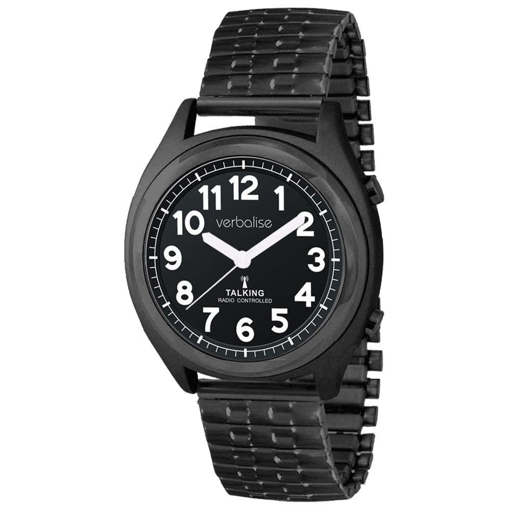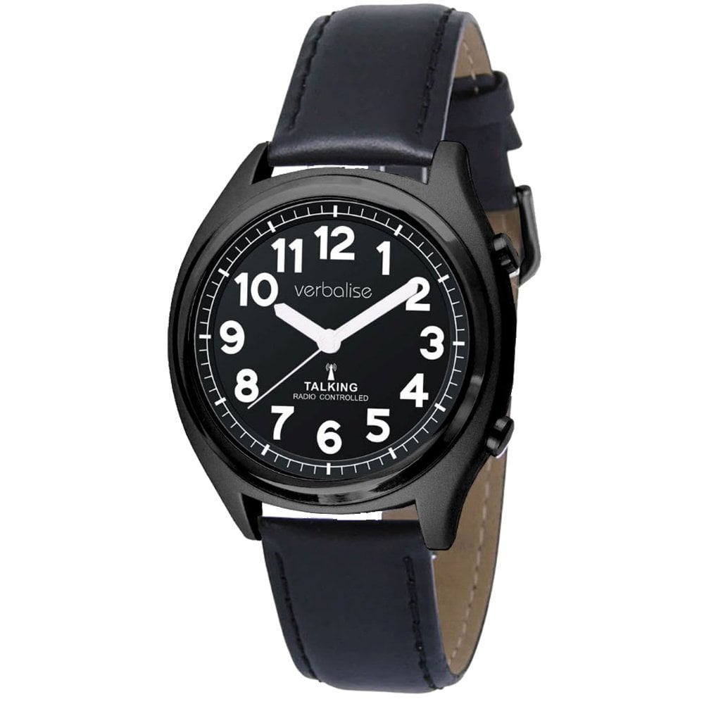 This Verbalise gender neutral talking watch, has a black resin case and a black face containing white contrasting numbers and hands. Fitted with a black leather strap, the case diameter is 39mm.