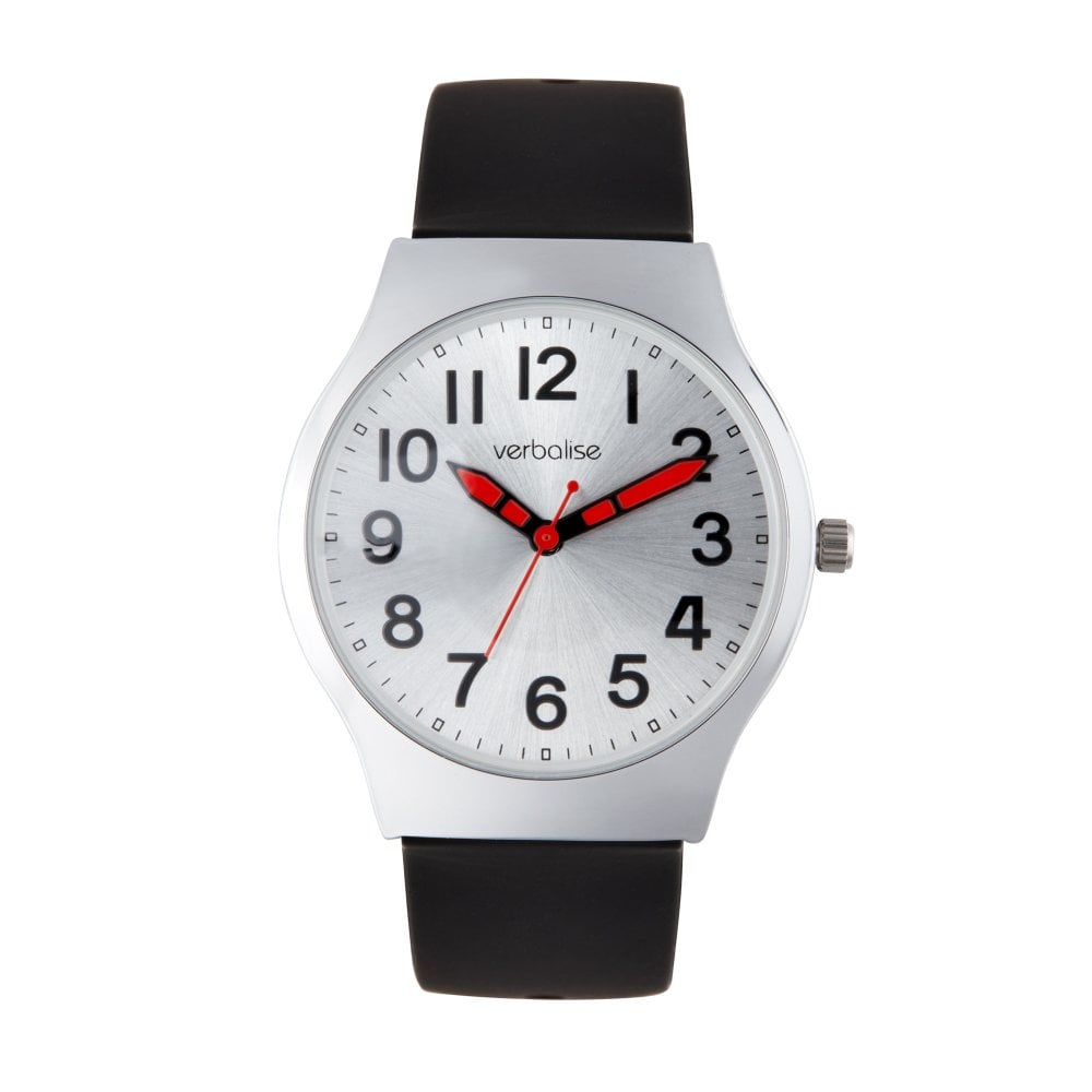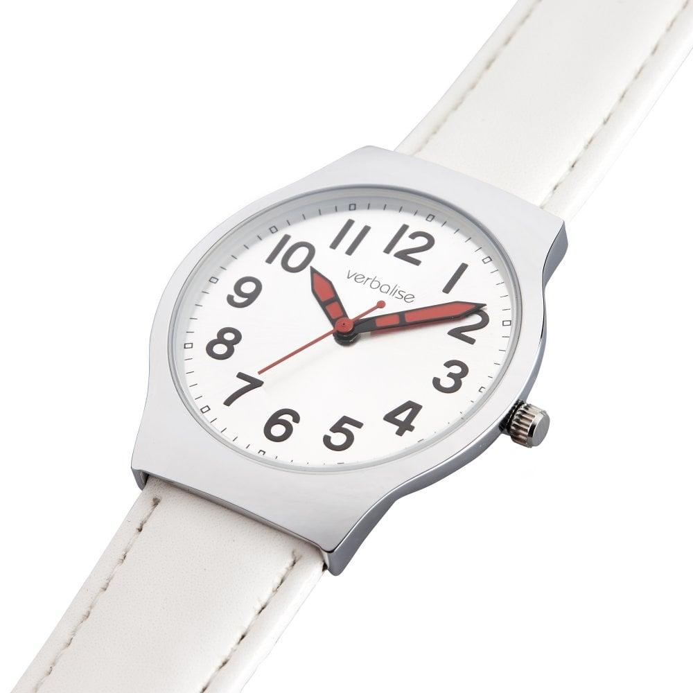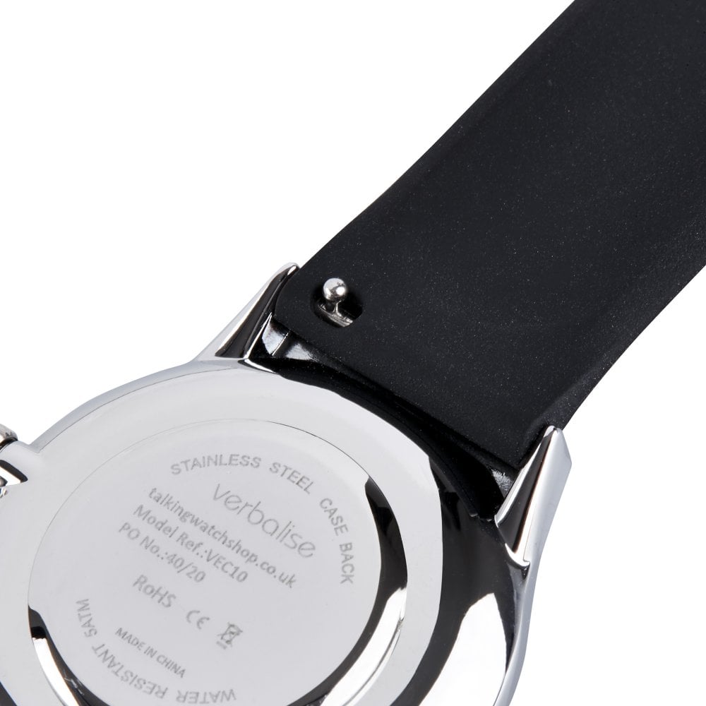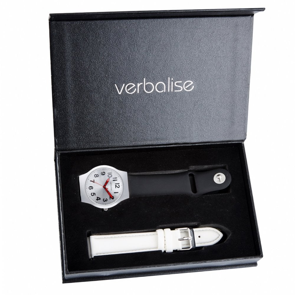 This elegant slimline designed Verbalise ladies watch is fitted with a comfortable black silicone pin and tuck strap, ideal for daily wear, and as the watch is water resistant to 5ATM it can also be worn while showering or surface swimming. For more formal occasions, quick release pins enable easy switching to the white genuine leather strap with silver buckle fastener.