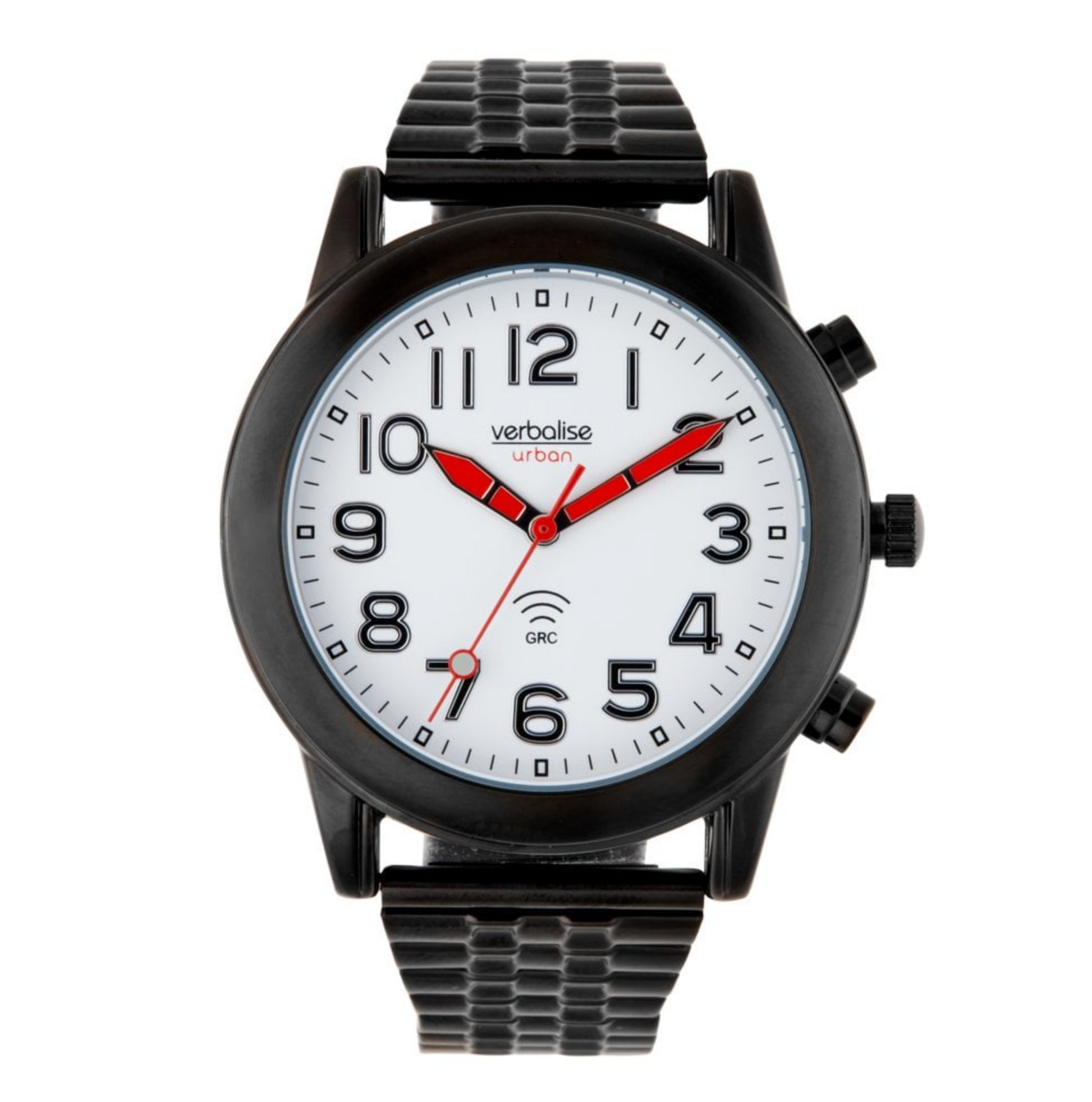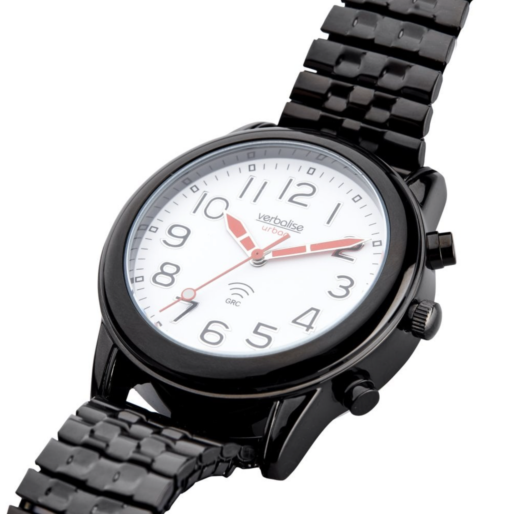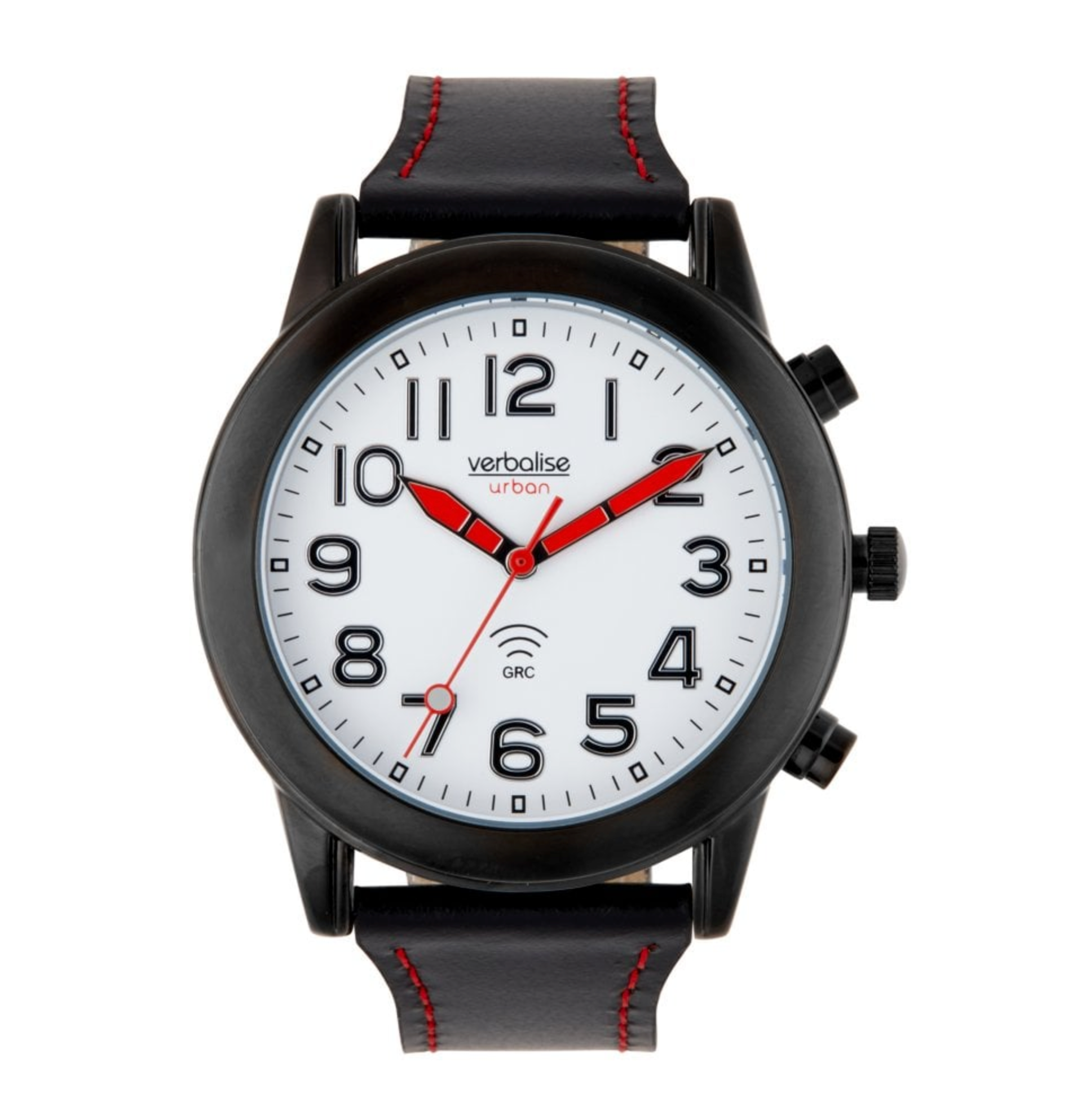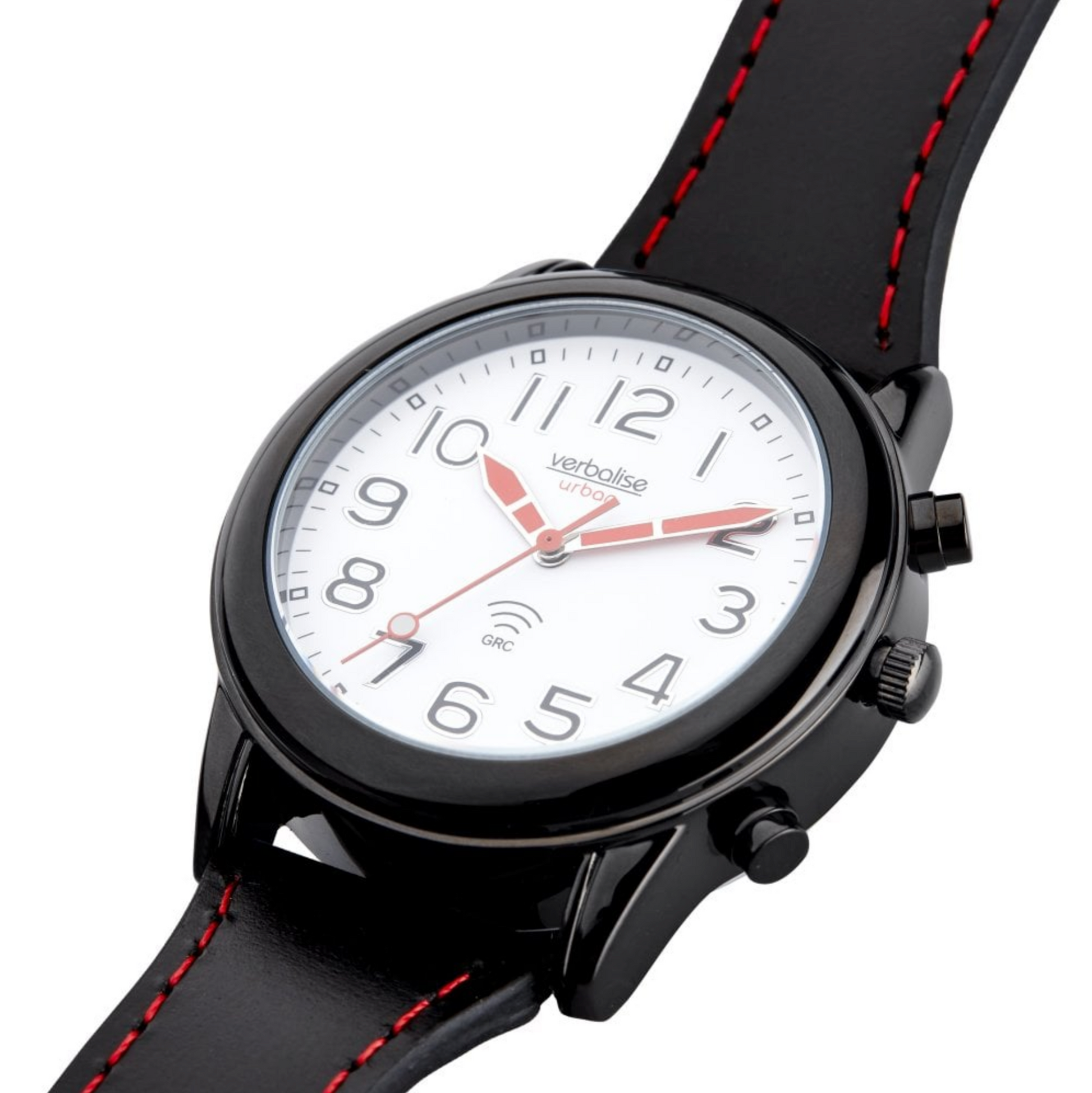 This Verbalise Urban Series men's talking watch has a piano black case surrounding the white face containing red contrasting numbers edged in silver, and red and silver edged hands. Fitted with a black pin and tuck leather strap with red stitching, the case diameter is 39mm.