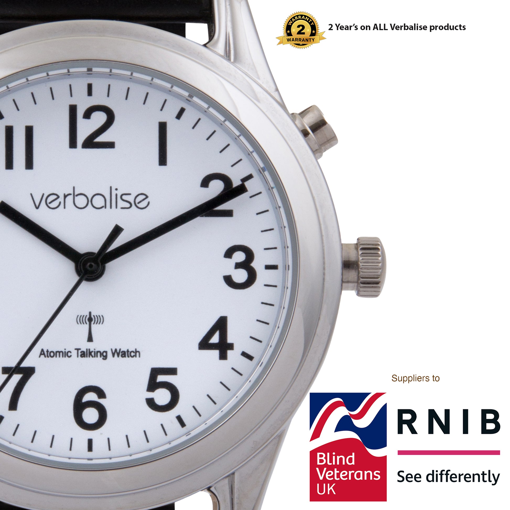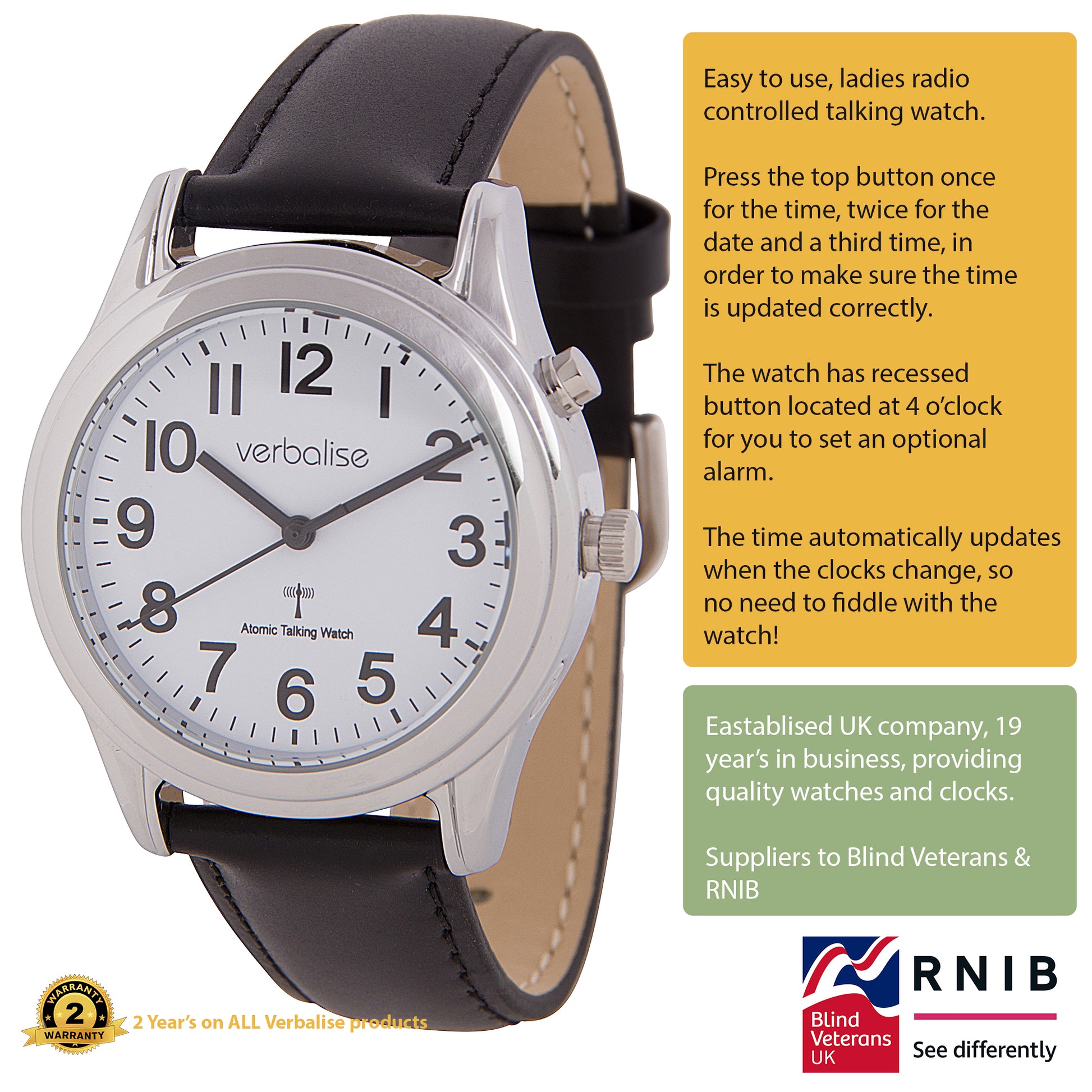 This ladies talking watch has a silver case with a white face with contrasting black hands and numbers. Fitted with a black genuine leather strap, the case diameter is 36mm weighing just 45g one of the smallest talking watches on the market. A clear male English voice speaks the time with a press of the 2 o’clock button a second press speaks the date.This talking watch also has an optional daily alarm plus an hourly time announcement on the hour from 6am to 9pm.