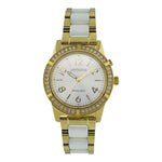 This Verbalise deluxe talking watch embellished with 42 genuine Swarovski crystals has a gold case that surrounds a white sun-ray face with gold numbers at 12, 2, 4, 6, 8 & 10. The white hour and minute hands are edged in gold to complement the case.